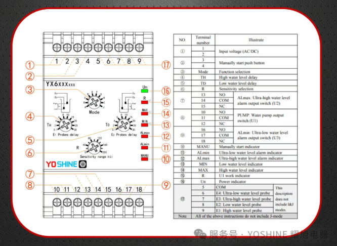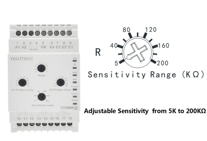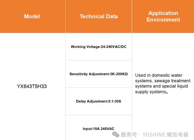 El relé de nivel de líquido de diez funciones YX643T5H33 es adecuado para diversas ocasiones, como tratamiento civil, industrial, agrícola, de aguas residuales, etc.