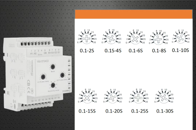 El relé de nivel de líquido de diez funciones es como un "maestro de amortiguación" inteligente. Las posiciones E1 y E2 en el armazón están claramente marcadas con un rango de escala de 0,1 a 30 segundos. Simplemente gire la perilla a la escala correspondiente de acuerdo con los requisitos del escenario de aplicación real y se podrá configurar el tiempo de retardo.